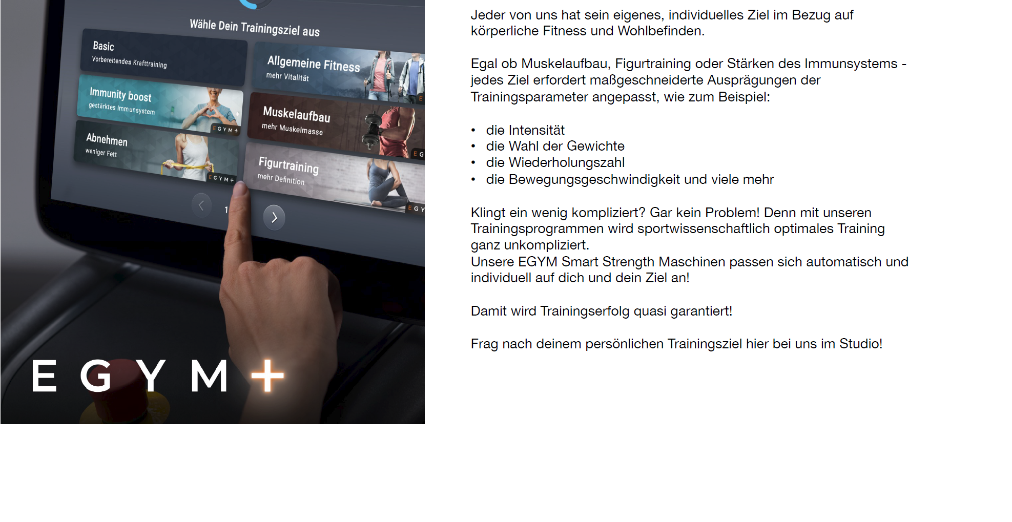 Der EGYM- Zirkel ist ein moderner und vernetzter Trainingsbereich, das dank intelligenter Software genau auf deine individuellen Ziele abgestimmt ist und so optimale Ergebnisse erreicht werden können.